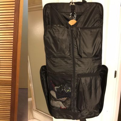 Double ample storage space: Two main compartments designed for carrying suits, uniforms, coats, dresses. Multiple interior zippered pockets for ties, socks, and small accessories.